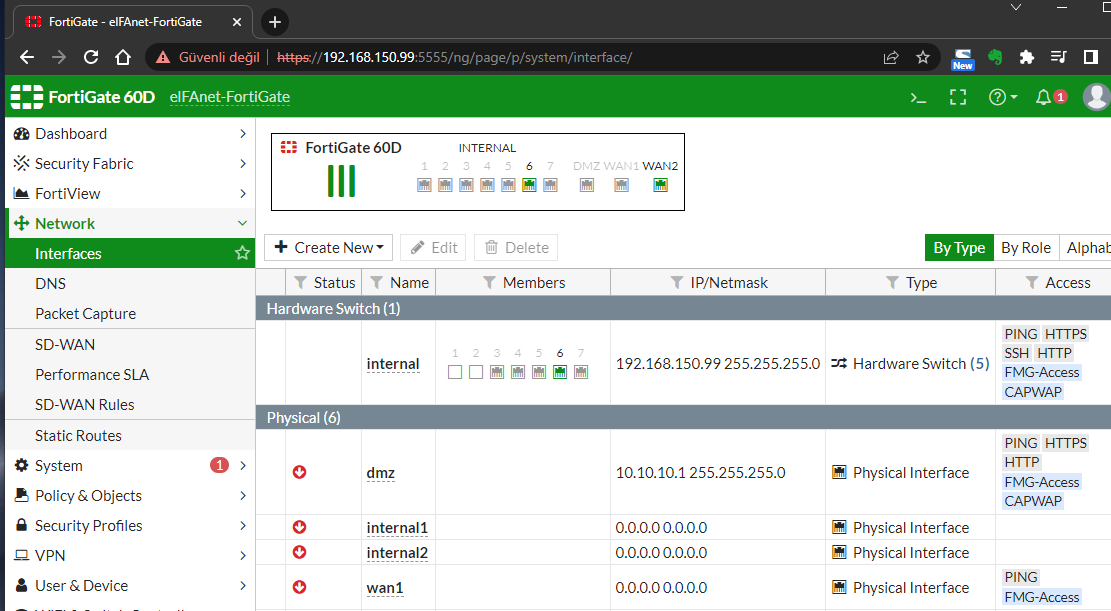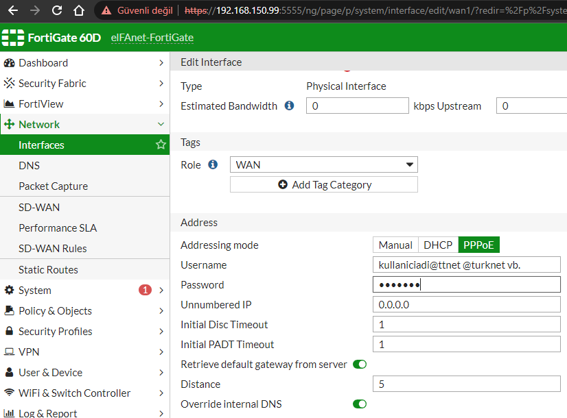 Ardından gelen ekranda sol tarafta Network kırılımının altında Interfaces sekmesine giriyoruz. Burada modeminizden gelen kabloyu taktığınız (wan1 veya wan2 gibi) interface’e çift tıklayarak edit ekranına giriyoruz.