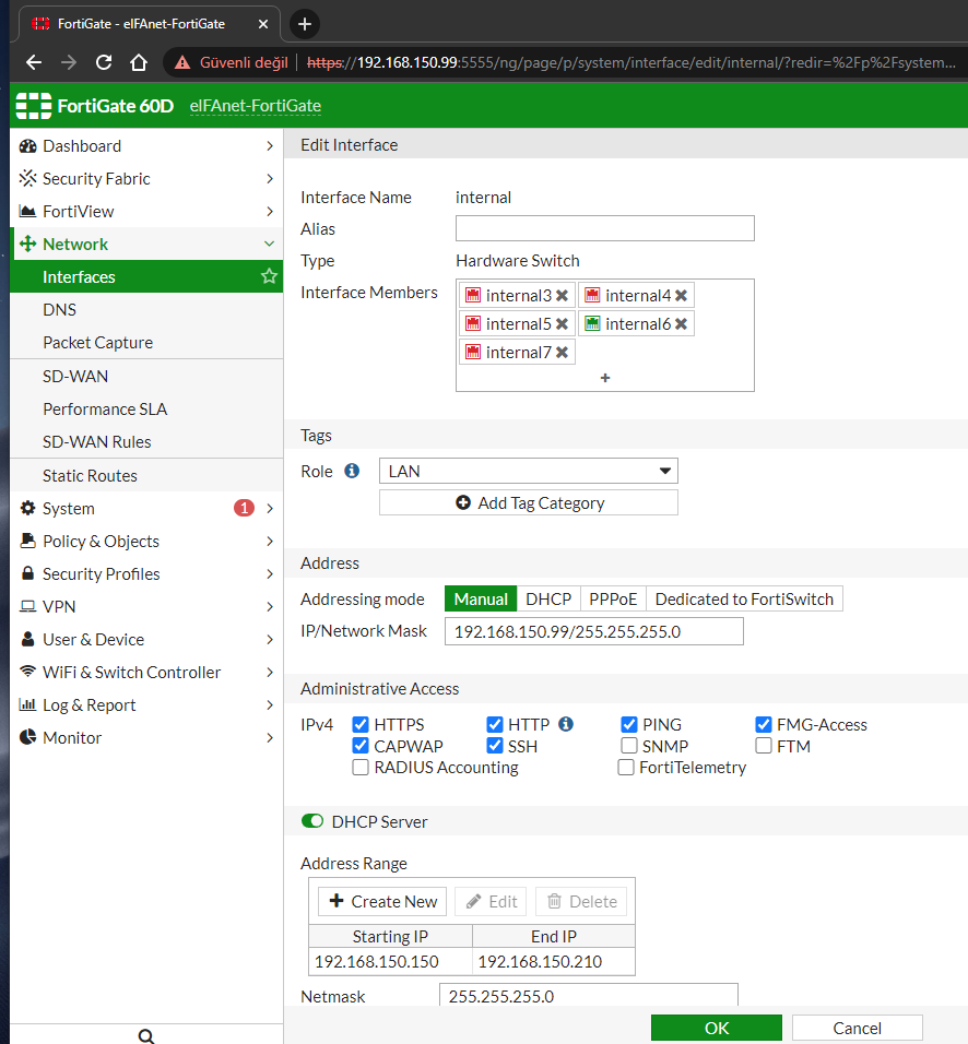 Onay sonrası Interfaces sayfasına geri döneceğiz. Burada Hardware Switch altında Internal satırına çift tıklayarak giriyoruz. Burada FortiGate üzerindeki interfacelerin IP adresi dağıtıp dağıtmayacağı ve hangi adres bloğunu kullandıracağını seçiyoruz. Örneğin aşağıdaki resimdeki gibi bir yapılandırmada DHCP Server aktif edildiği için ve aşağıdaki Starting IP ve End IP 192.168.150.150 – 192.168.150.210 değerlerinde olduğu için bilgisayarlarımız 150 ‘den başlayarak IP adresi alacaktır. Address sütunundaki Manual olarak seçilerek 192.168.150.99 değeri girilmesiyle de bu değer Gateway değeri olarak atanacaktır. Buradaki ayarların yapılmasından sonra sayfa altında ve ortada yer alan OK tuşuyla işlemler kaydedilir.