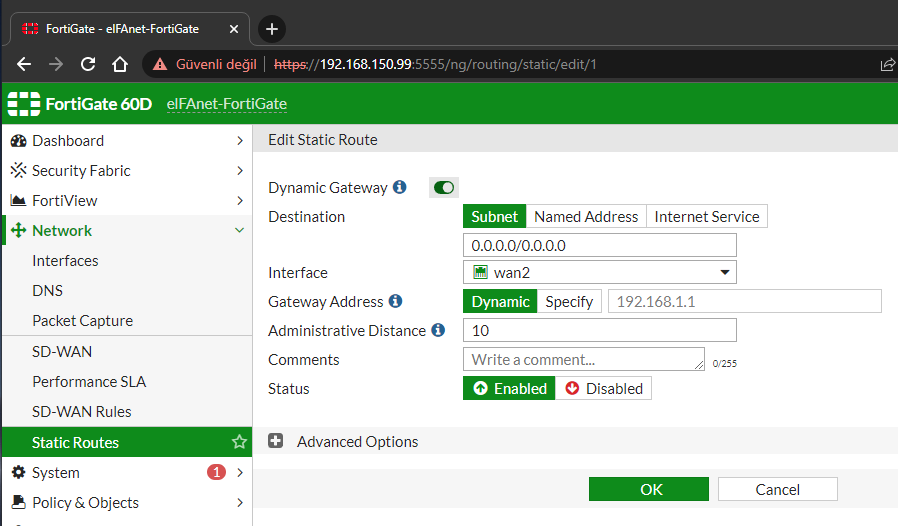 Daha sonra modemimizi NAT modda çalıştırıyorsak yani köprü moduna almadıysak veya fiber modemse static route yazmamız gerekmektedir. Bunun için soldaki Network kırılımının altında yer alan Static Routes kısmına gireceğiz. Burada üstte yer alan Create New butonuna basarak modemi bağladığımız Interface’imizi seçerek aşağıdaki gibi Static Route yazarak OK tuşuna basmalıyız.