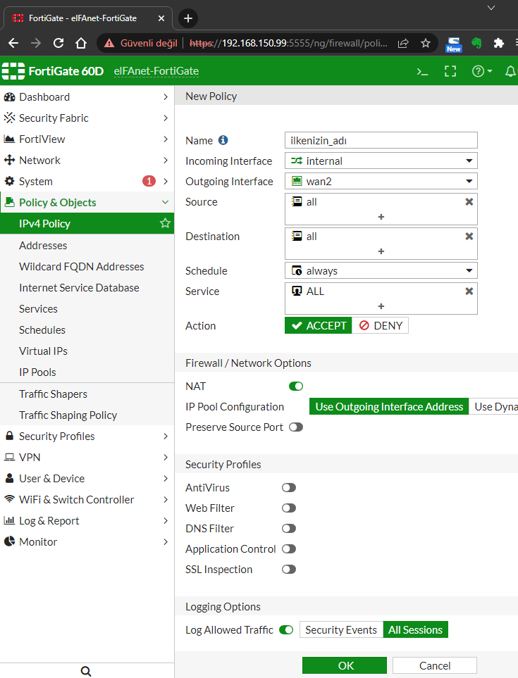 Son aşamada Policy (ilke) yazımı gerekmektedir. Bunun için sol menüde yer alan Policy&Objects kısmından IPv4 Policy sayfasına girerek üstte yer alan Create New butonuna tıklamalıyız. Burada Name kısmından ilkenize özel bir ad vererek, Incoming Interface kısmına Internal seçimini, Outgoing Interface kısmında modeminizi bağladığınız Wan1 veya Wan2 seçimini, Source, Destination ve Service kısımlarında da ALL seçimlerini yaparak ve tüm trafiği Loglamak için en alttaki Logging Options kısmında All Sessions’ı seçerek OK tuşuna basılır.