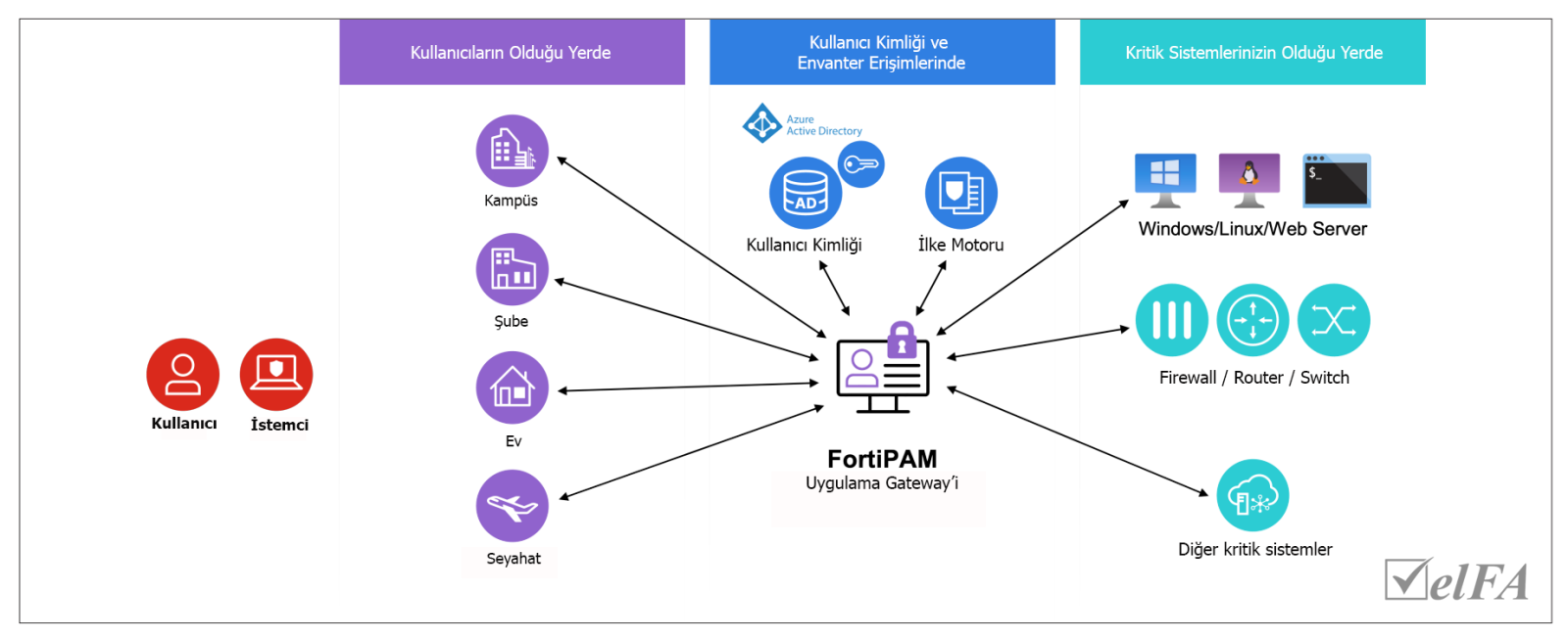 Hesap kimlik bilgilerinin yönetimi, ayrıcalıklı kullanıcı erişiminin kontrolü ve ayrıcalıklı hesaplardaki etkinliğin izlenmesi için FortiPAM teknolojisinden yararlanılır. Yüksek kullanılabilirlikle aktif/yedek HA yetenekleri ile sürekli çalışmayı sağlar.